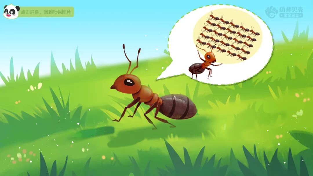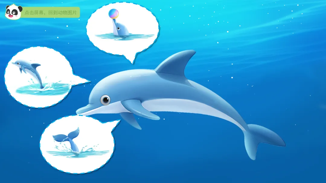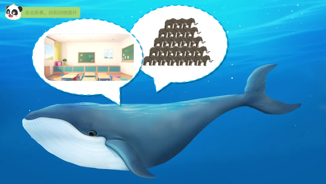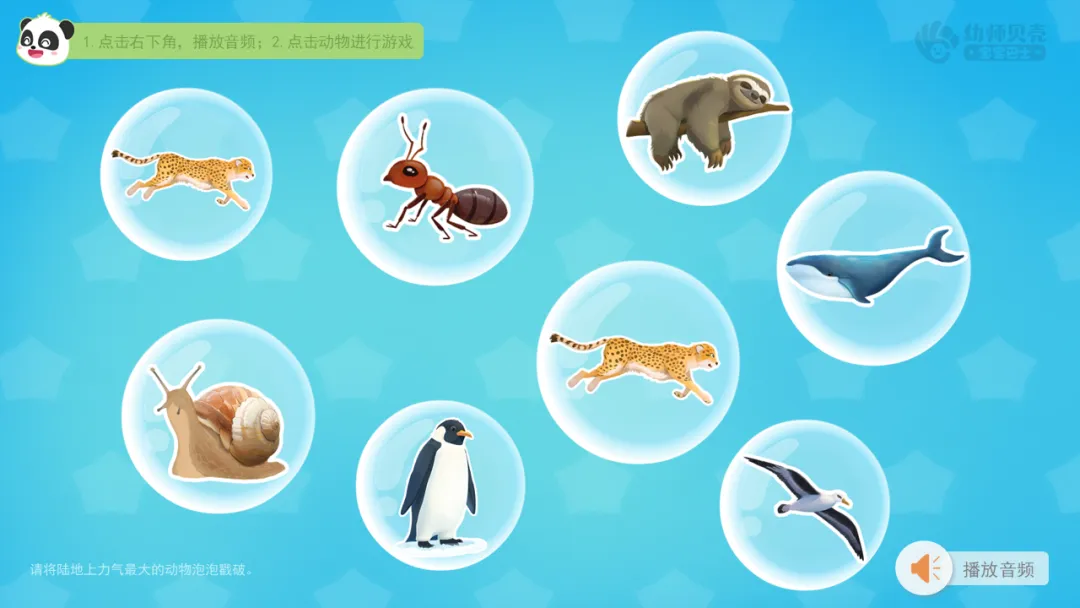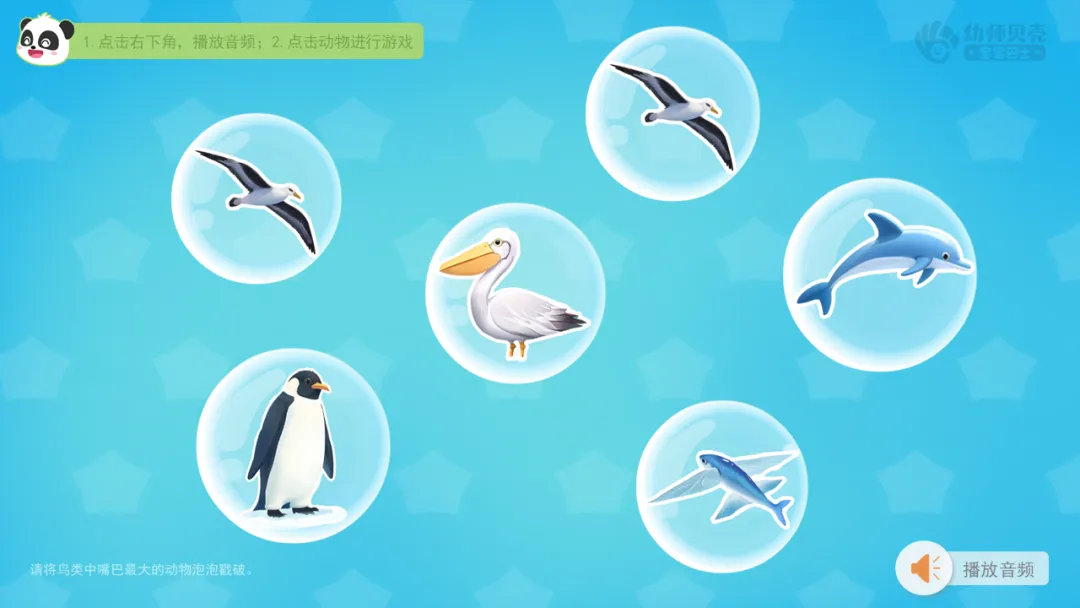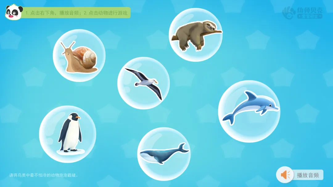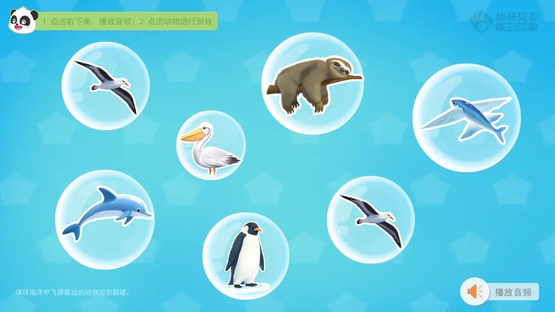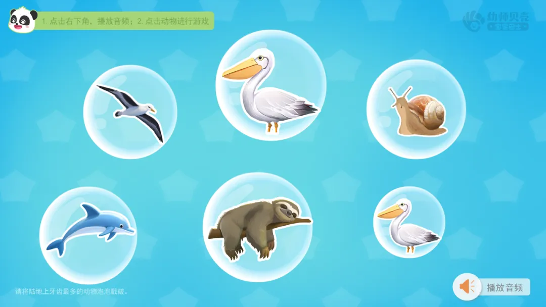 ——听听音频里介绍的是什么小动物,找到对应的泡泡,把它戳破。