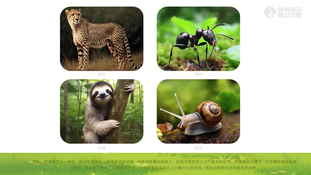 1.播放音频并出示组图“动物之最-1”,引导幼儿找一找陆地上牙齿最多/力气最大/最懒/跑得最快的动物。