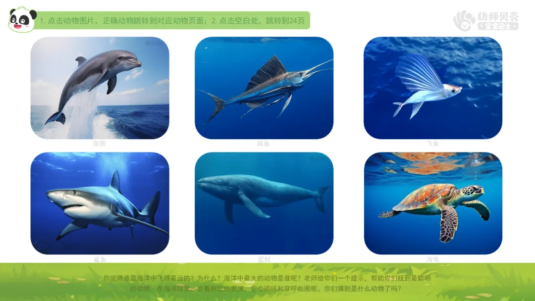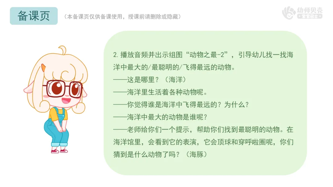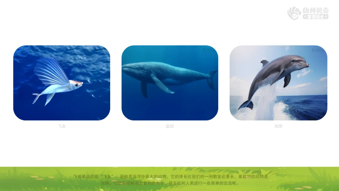 2.播放音频并出示组图“动物之最-2”,引导幼儿找一找海洋中最大的/最聪明的/飞得最远的动物。