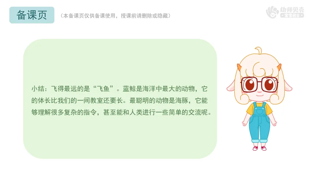 小结:飞得最远的是“飞鱼”。蓝鲸是海洋中最大的动物,它的体长比我们的一间教室还要长。最聪明的动物是海豚,它能够理解很多复杂的指令,甚至能和人类进行一些简单的交流呢。