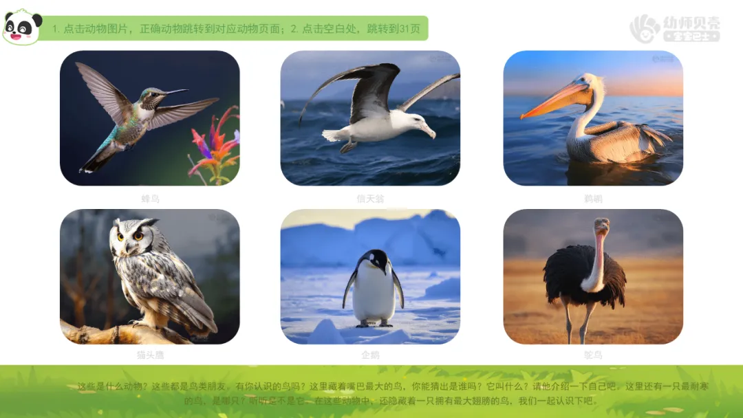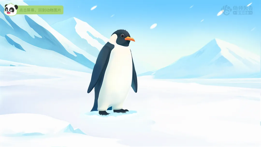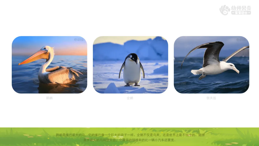 3.播放音频并出示组图“动物之最-3”,引导幼儿找一找鸟类中嘴巴最大的/最耐寒的/翅膀展开最大的动物。