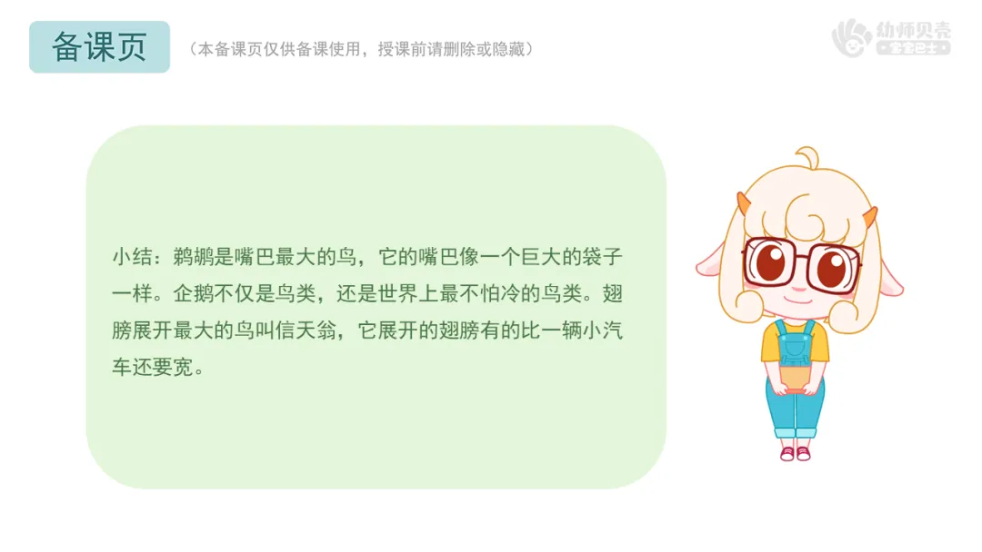 小结:鹈鹕是嘴巴最大的鸟,它的嘴巴像一个巨大的袋子一样。企鹅不仅是鸟类,还是世界上最不怕冷的鸟类。翅膀展开最大的鸟叫信天翁,它展开的翅膀有的比一辆小汽车还要宽。