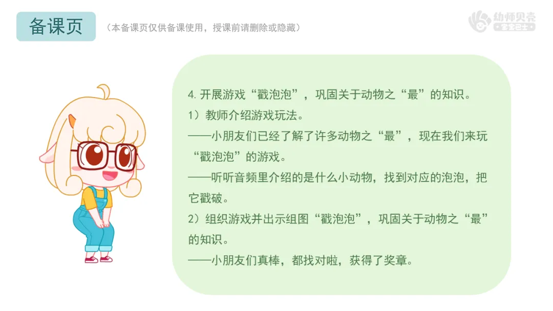——小朋友们已经了解了许多动物之“最”,现在我们来玩“戳泡泡”的游戏。