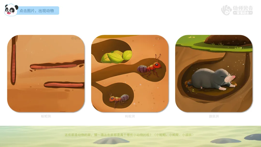 1.出示组图“地下的动物之家-1”,引导幼儿大胆猜测蚂蚁、鼹鼠、蚯蚓的家。