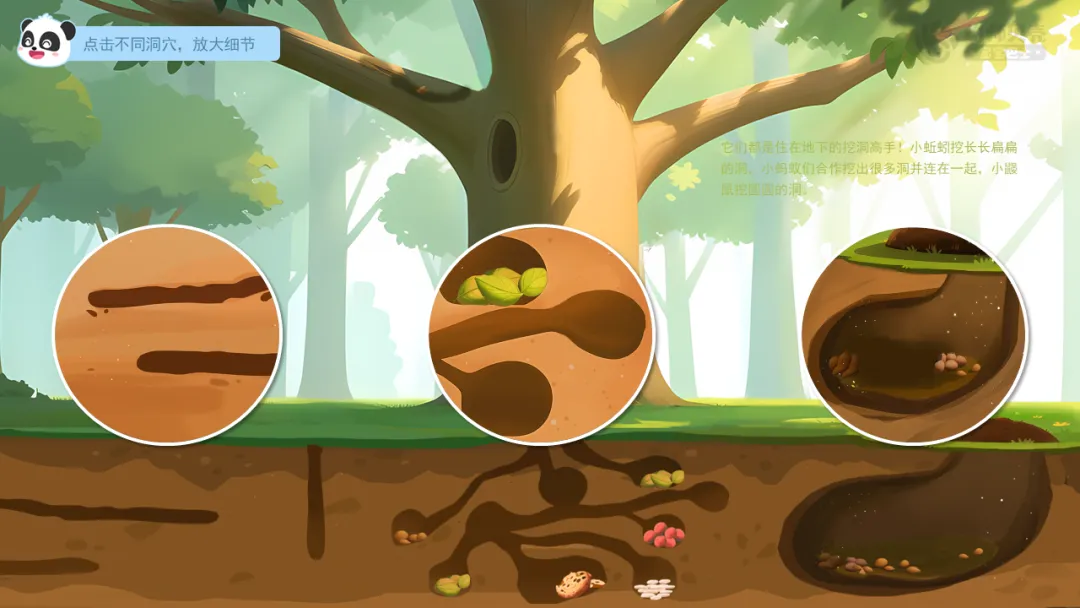 小结:它们都是住在地下的挖洞高手!小蚯蚓挖长长扁扁的洞,小蚂蚁们合作挖出很多洞并连在一起,小鼹鼠挖圆圆的洞。