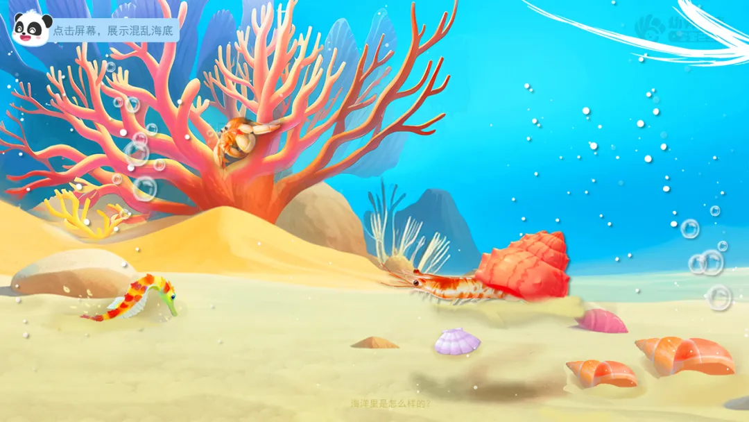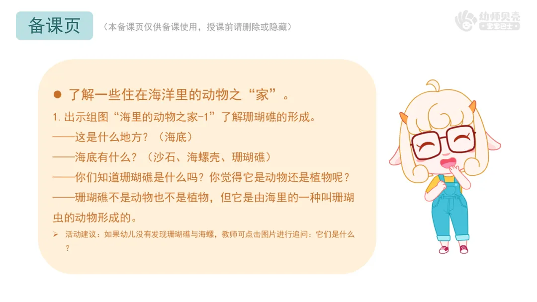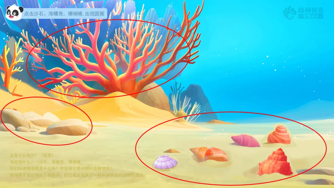 Ø活动建议:如果幼儿没有发现或不知道珊瑚礁与海螺,教师可点击图片进行追问:它们是什么?