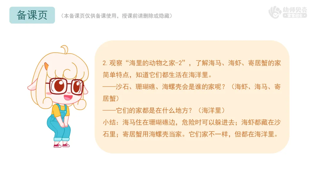 2.观察“海里的动物之家-2”,了解海马、海虾、寄居蟹的家简单特点,知道它们都生活在海洋里。