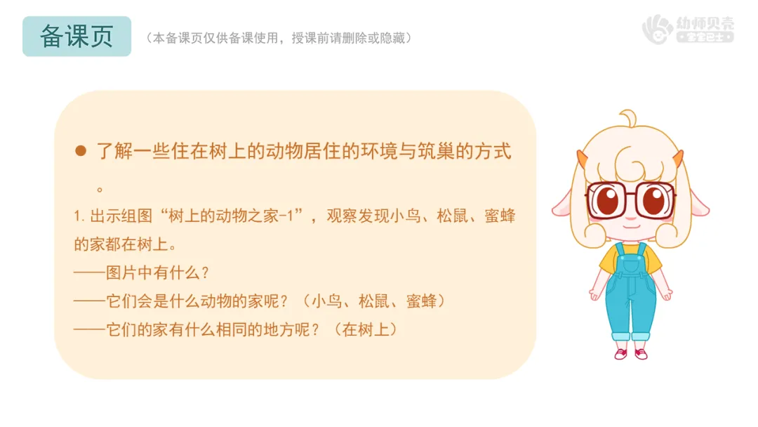 1.出示组图“树上的动物之家-1”,观察发现小鸟、松鼠、蜜蜂的家都在树上。
