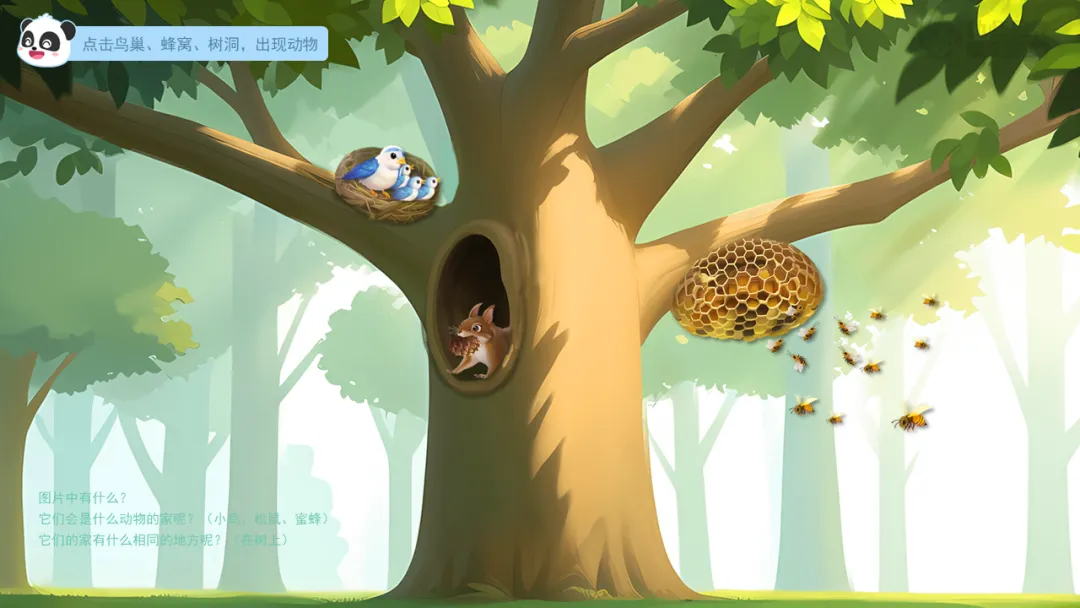 2.出示组图“树上的动物之家-2”,了解小鸟、松鼠、蜜蜂家的特点。
