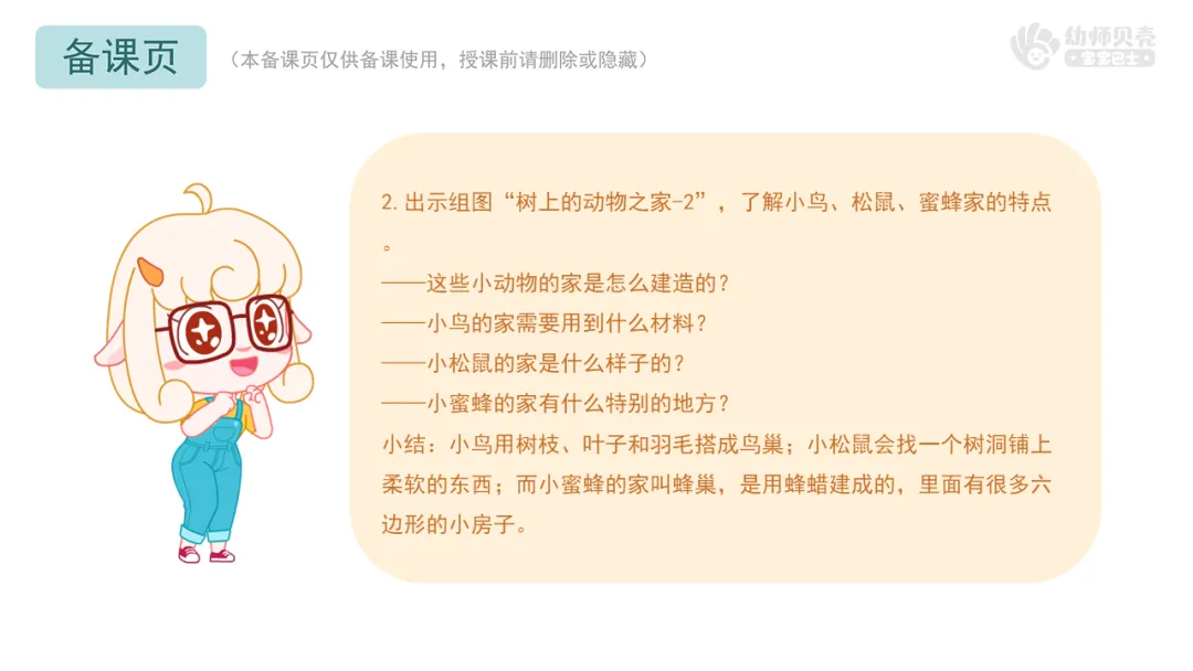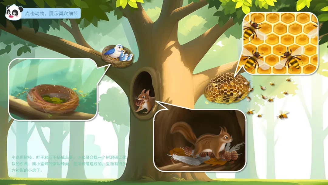 小结:小鸟用树枝、叶子和羽毛搭成鸟巢;小松鼠会找一个树洞铺上柔软的东西;而小蜜蜂的家叫蜂巢,是用蜂蜡建成的,里面有很多六边形的小房子。