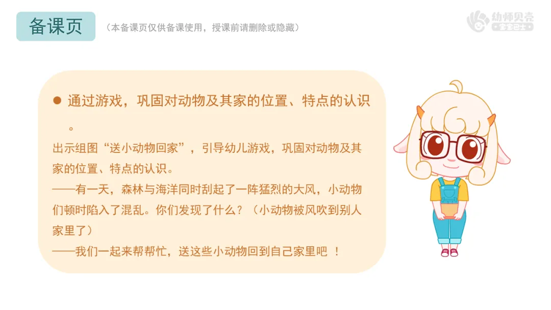 l通过游戏,巩固对动物及其家的位置、特点的认识。