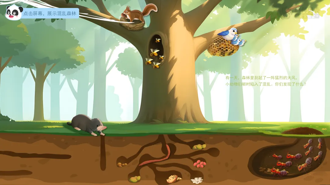 ——有一天,森林与海洋同时刮起了一阵猛烈的大风,小动物们顿时陷入了混乱。你们发现了什么?(小动物被风吹到别人家里了)