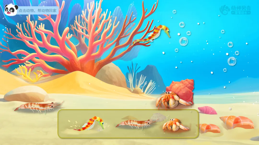 ——沙石、珊瑚礁、海螺壳会是谁的家呢?(海虾、海马、寄居蟹)