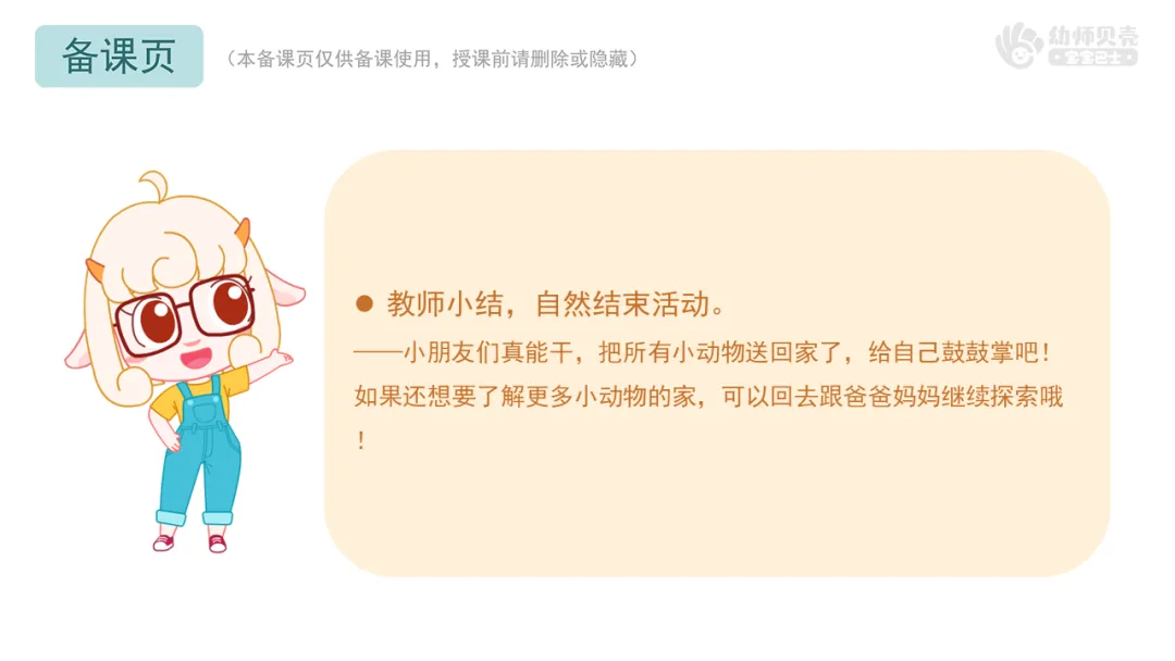 ——小朋友们真能干,把所有小动物送回家了,给自己鼓鼓掌吧!如果还想要了解更多小动物的家,可以回去跟爸爸妈妈继续探索哦!