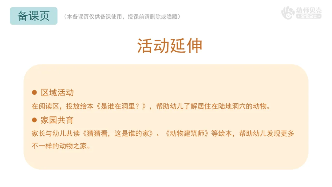 家长与幼儿共读《猜猜看,这是谁的家》、《动物建筑师》等绘本,帮助幼儿发现更多不一样的动物之家。