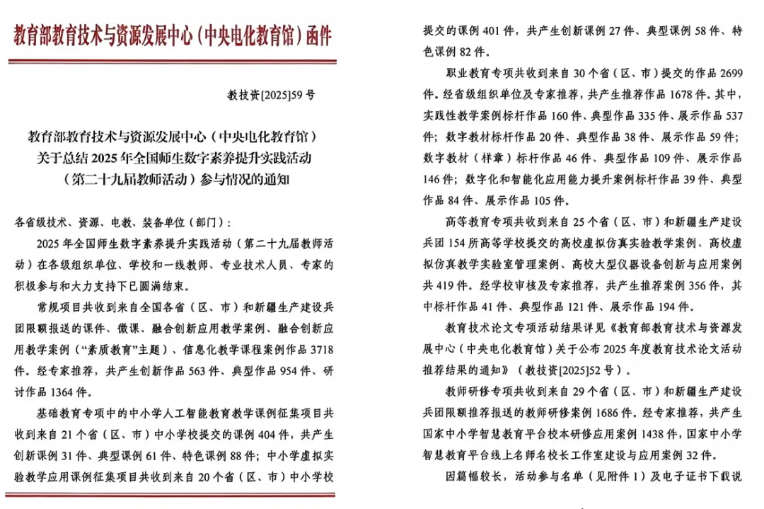 近日,由教育部教育技术与资源发展中心(中央电化教育馆)主办的全国师生信息素养提升实践活动圆满结束。该活动已连续举办二十九届,是面向全国教师与专业技术人员的重要赛事。