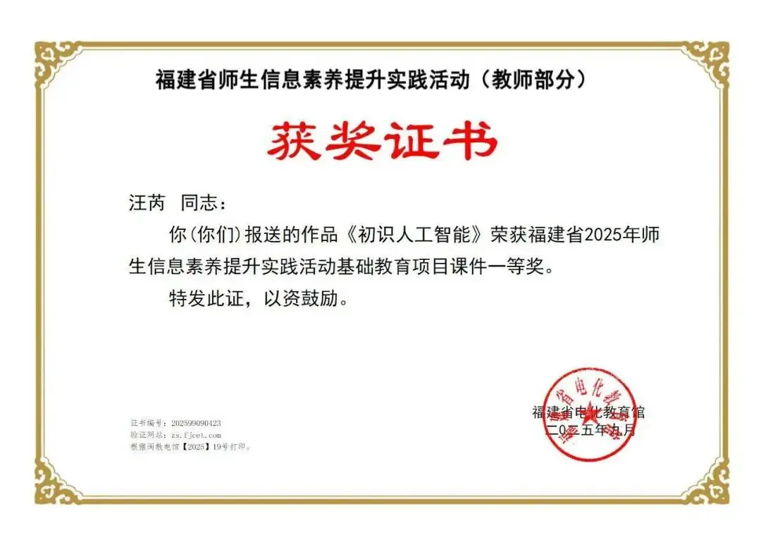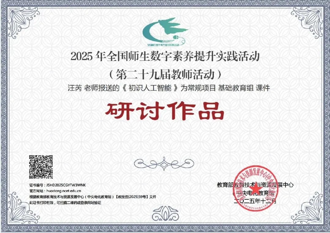 在本次活动中,我校汪芮老师凭借出色的信息素养和创新探索,提交的课件类作品《初识人工智能》获评基础教育组课件研讨作品、省级一等奖,为学校教育教学发展再添光彩。
