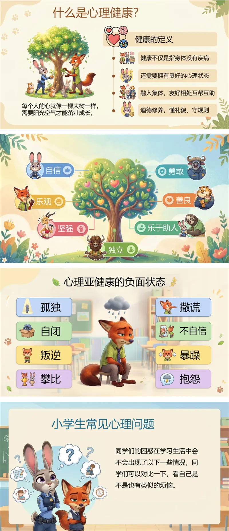 讲解心理健康的定义:通过“心灵大树” 比喻,说明心理健康需要 “阳光(积极心态)、空气(集体包容)”,健康不仅是无疾病,还包括自信、善良、懂规则、能与人友好相处等。