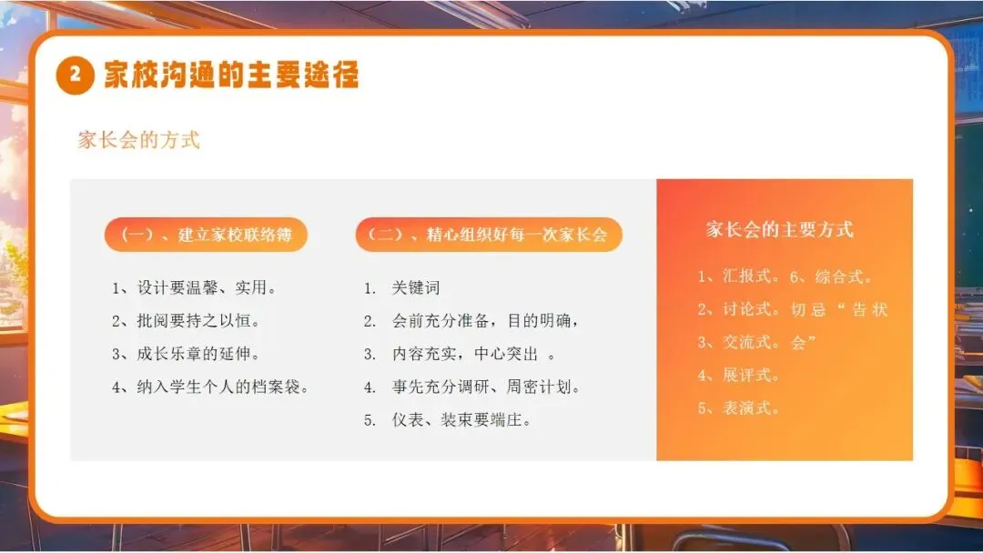 家长会的主要方式包括:汇报式、讨论式、交流式、展评式、表演式、综合式。但切忌开成 "告状会"。