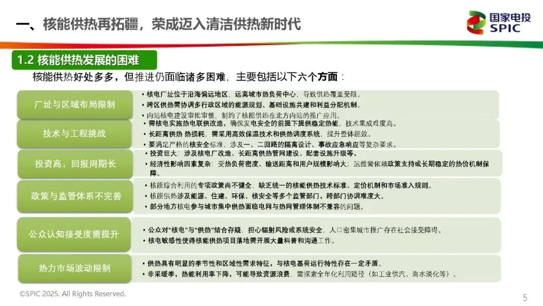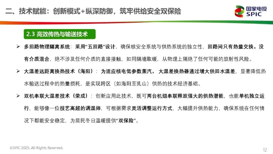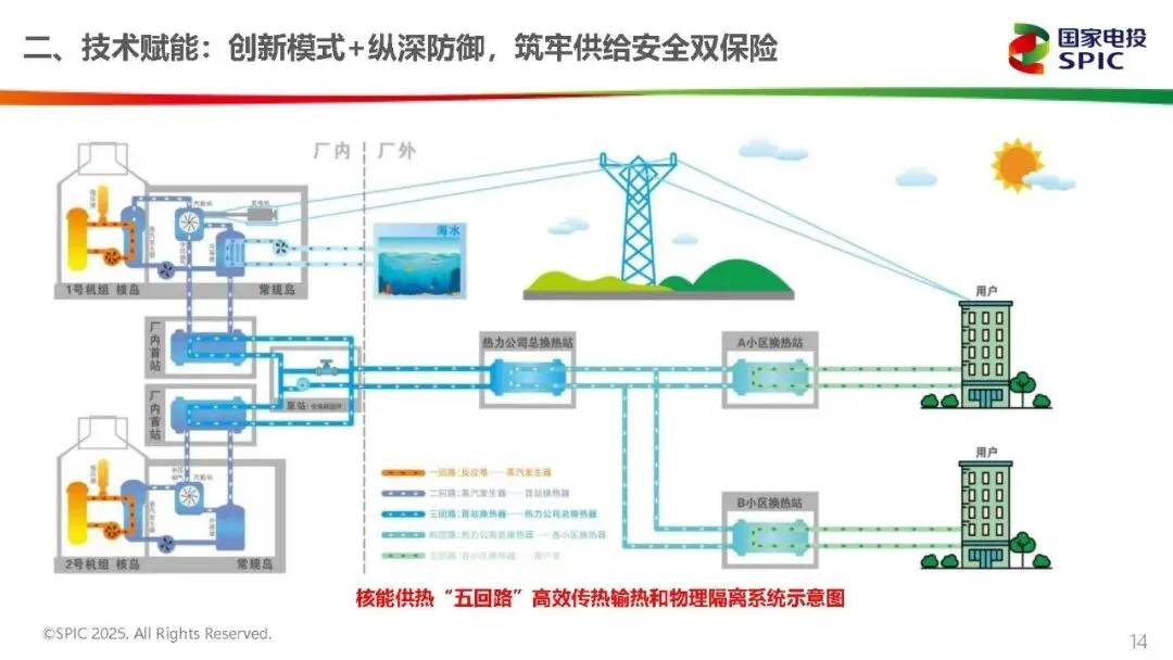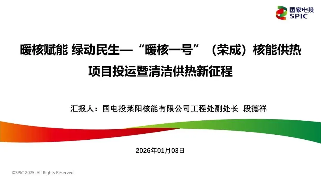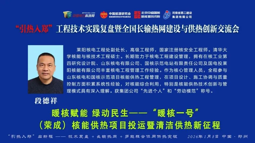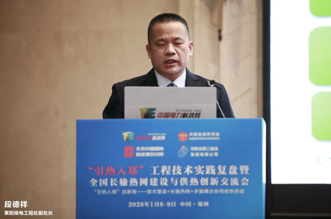 莱阳核电工程处副处长段德祥发表《暖核赋能,绿动民生——“暖核一号”(荣成)核能供热项目投运暨清洁供暖新征程》演讲。以“暖核一号”为例,核能与长输热网融合的零碳路径清晰可鉴。作为国家“十四五”重点项目,其实现三级跨越:2019年成国内首个商用核能供热工程,2021年助力海阳建成“零碳供暖城市”,2023年覆盖威海荣成,供暖面积达 1250万平方米,终结当地年耗煤18万吨历史。核心技术上,创新“核电机组中间级抽汽”模式填补百万千瓦级机组供热空白,“四重隔离”设计确保核岛与供热系统隔绝;83公里长输管网采用“大温差+高保温”技术,热损失≤1℃,输送效率94%。投运成效显著:民生层面室温稳定22-25℃,满意度98.6%,供暖费低15%;生态层面年替代原煤39万吨,减排二氧化碳72万吨,荣成供暖季PM2.5下降16%。目前已形成“核电+政府+管网公司”合作模式,未来计划拓展至烟青地区,推动“核能+储热”耦合,为长输热网提供稳定清洁热源。