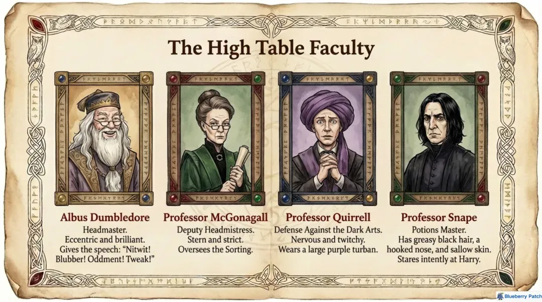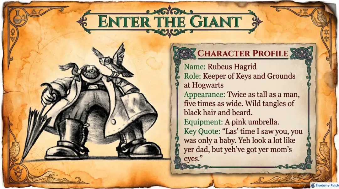 比如在 第4章《钥匙保管员》 里,海格(Hagrid)第一次登场。课件里不仅画出了他“两倍于常人身高、五倍于常人宽度”的体型,还标注了他手里拿的那把粉色小雨伞(其实是他的魔杖!)。