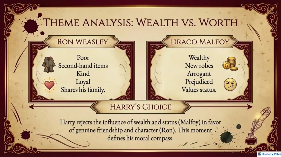 还有 第6章 里那个令人讨厌的马尔福(Draco Malfoy),课件通过对比他和罗恩的穿着、家境和态度,不仅教了单词,还引导孩子思考书中关于“贫富与品格”的深层主题 。