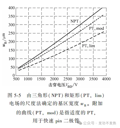 5、现代快恢复二极管多采用穿通(Punch Through, PT)设计,电场形状为梯形;击穿电压由式(5-11)描述,基区宽度可减小至NPT设计的约63%(式(5-13));