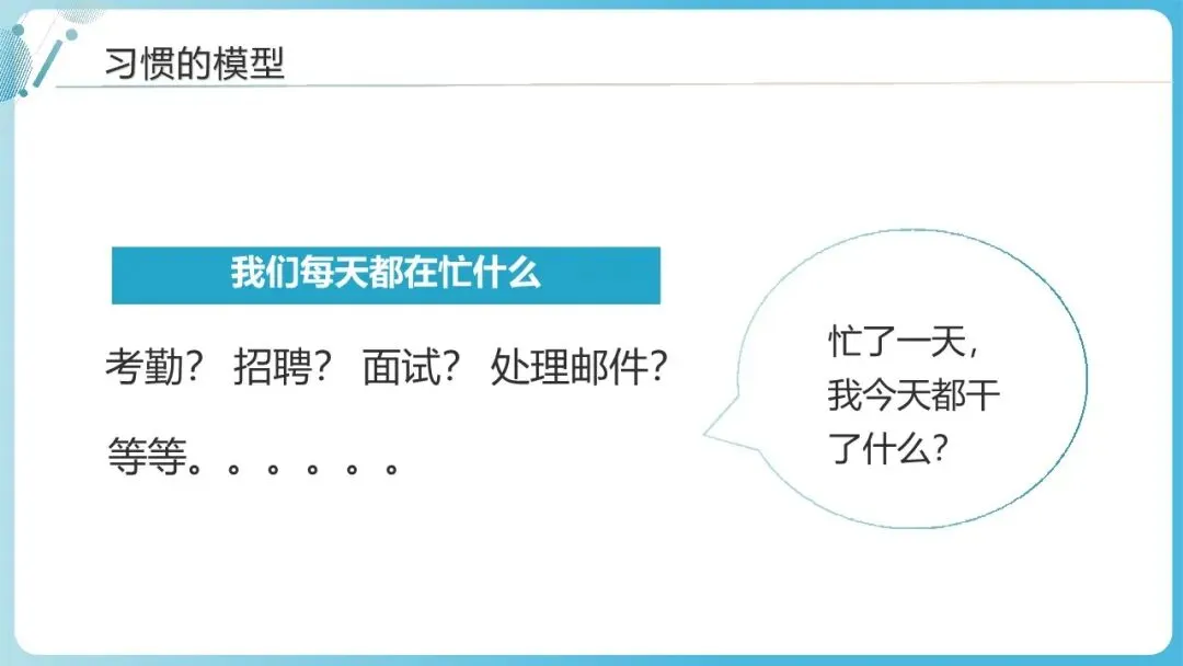 场景应用:职场中,优先预留时间学习新的HR工具、梳理业务需求(第二象限),而非整天被即时消息、临时琐事缠身;生活中,优先预留时间陪伴家人、锻炼身体(第二象限),避免被无意义的娱乐消耗时间。