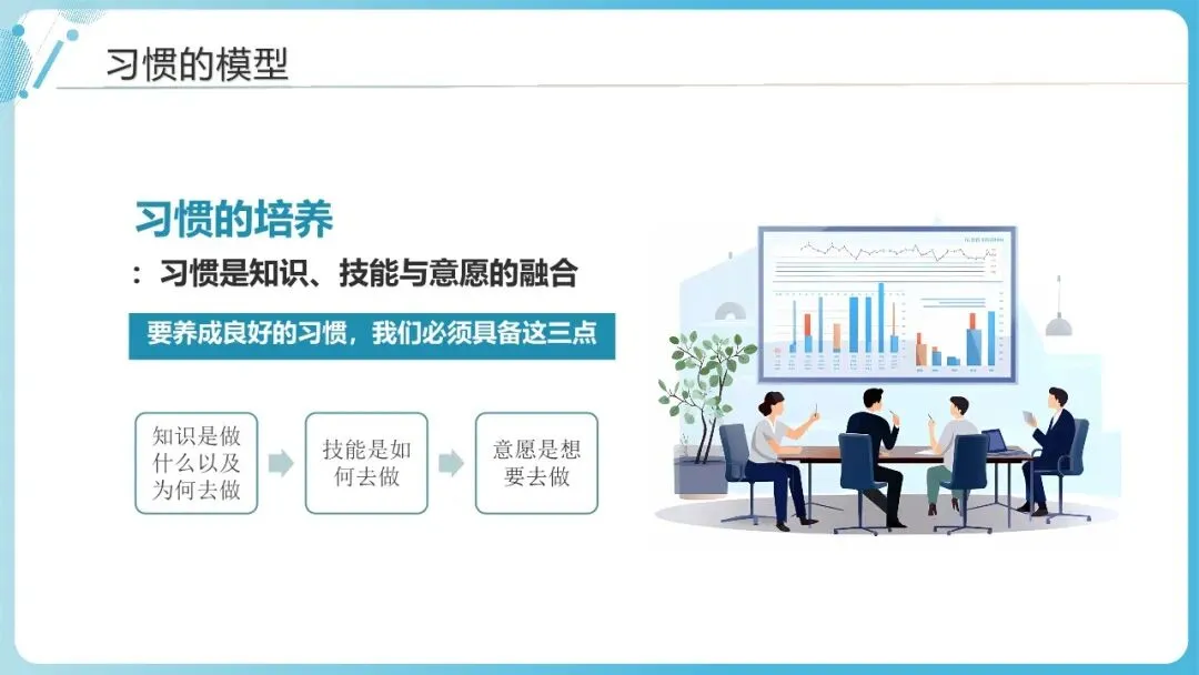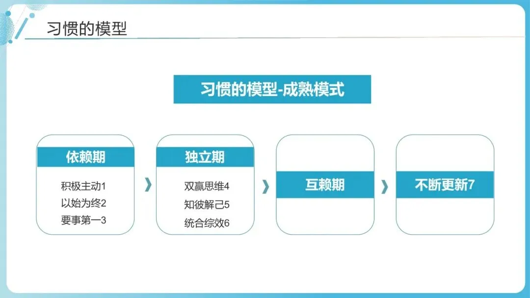 高效能不是“终点”,而是“持续迭代的过程”。习惯7是前六个习惯的保障,核心是通过“身心社灵”四个维度的持续更新,保持内在的活力与外在的竞争力,避免陷入“职业倦怠”或“能力停滞”。