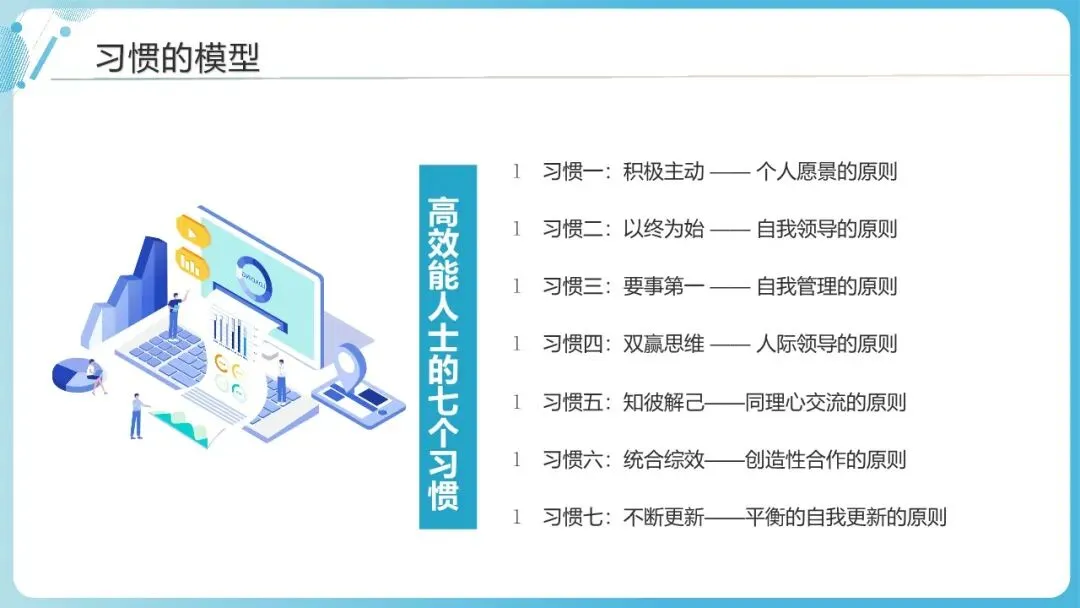 结合场景,灵活应用:七个习惯不是“教条”,而是“工具”,需结合自身的职场岗位、生活状态灵活调整实践方法。比如,HRBP可重点强化“双赢思维”“知彼解己”(对接业务、沟通员工),而研发人员可重点强化“以终为始”“协作增效”(项目推进、团队协作)。