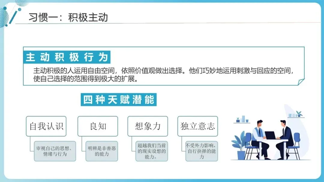 “高效能人士的七个习惯”源自史蒂芬·柯维的经典著作,核心逻辑是“从内而外实现自我重塑”——先掌控自我,再学会协作,最终实现持续成长与价值创造。这七个习惯并非孤立存在,而是形成了“个人成功→公众成功→持续更新”的完整成长闭环,适用于职场进阶、人际关系经营、自我管理等多个场景。以下将从核心内涵、实践方法、场景应用三个层面,系统解读每个习惯的价值与落地路径。