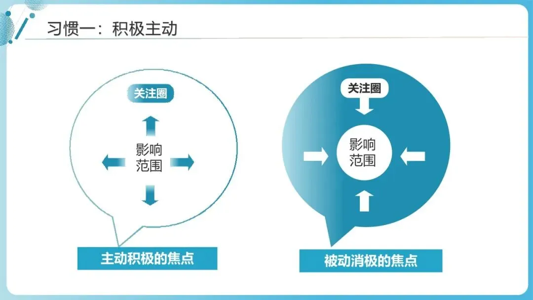 核心内涵:积极主动的人以“选择”为核心,不被外界环境、他人态度所左右,聚焦“自己能控制的事”(影响圈),而非抱怨“无法控制的事”(关注圈)。他们明白,人生的回应权永远在自己手中,而非“环境决定论”的奴隶。