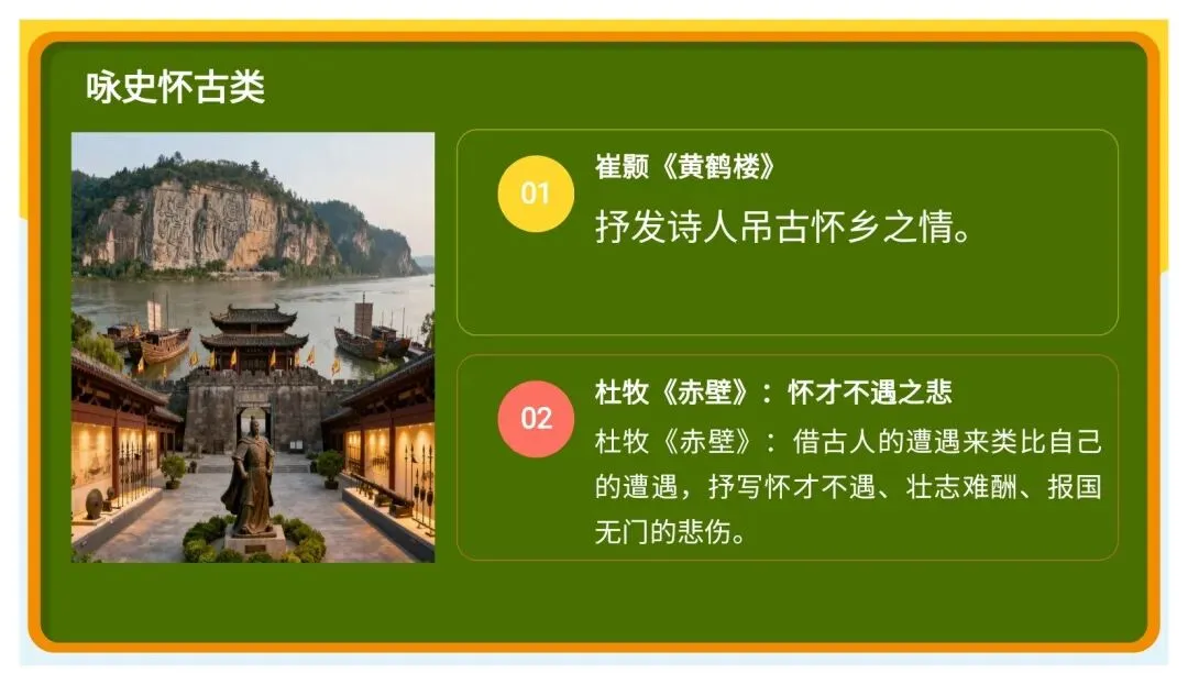 份。这份八年级上册语文期末复习诗词鉴赏专题课件,共33页,围绕诗词鉴赏核心考点与课内实战展开体系化梳理。课件先拆解分析内容、品析语言、领悟情感、描述画面四大核心考点,搭配答题技巧与思路点拨;再对《野望》《赤壁》等课内经典诗词进行逐篇赏析,结合典型例题讲解考点应用;最后设置随堂训练模块,实现“知识点讲解—例题精析—实战练习”的闭环复习。整体内容紧扣期末考纲,既有方法指导又有真题演练,是八年级学生攻克诗词鉴赏难题、提升应试能力的实用复习资料。八年级上册语文期末复习诗词鉴赏专题课件,共33页,围绕诗词鉴赏核心考点与课内实战展开体系化梳理。课件先拆解分析内容、品析语言、领悟情感、描述画面四大核心考点,搭配答题技巧与思路点拨;再对《野望》《赤壁》等课内经典诗词进行逐篇赏析,结合典型例题讲解考点应用;最后设置随堂训练模块,实现“知识点讲解—例题精析—实战练习”的闭环复习。整体内容紧扣期末考纲,既有方法指导又有真题演练,是八年级学生攻克诗词鉴赏难题、提升应试能力的实用复习资料。