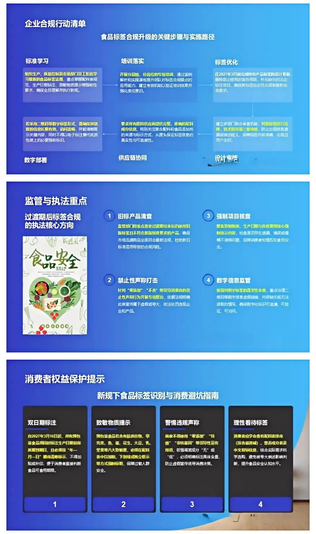 从监管层面来讲,这个标准明确了标签标注的硬性要求、豁免范围、文字规范等关键内容,让执法有了统一标尺,能有效解决以往执法尺度不一的问题,推动整个食品标签管理走向规范化。对食品生产经营企业而言,学好这个标准更是重中之重 —— 它能帮企业规避因虚假标注、遗漏过敏原信息、营养成分表错误等带来的行政处罚、产品召回风险,同时合规清晰的标签也是企业诚信的体现,能增强消费者信任,提升品牌竞争力,甚至为产品接轨国际市场打下基础。