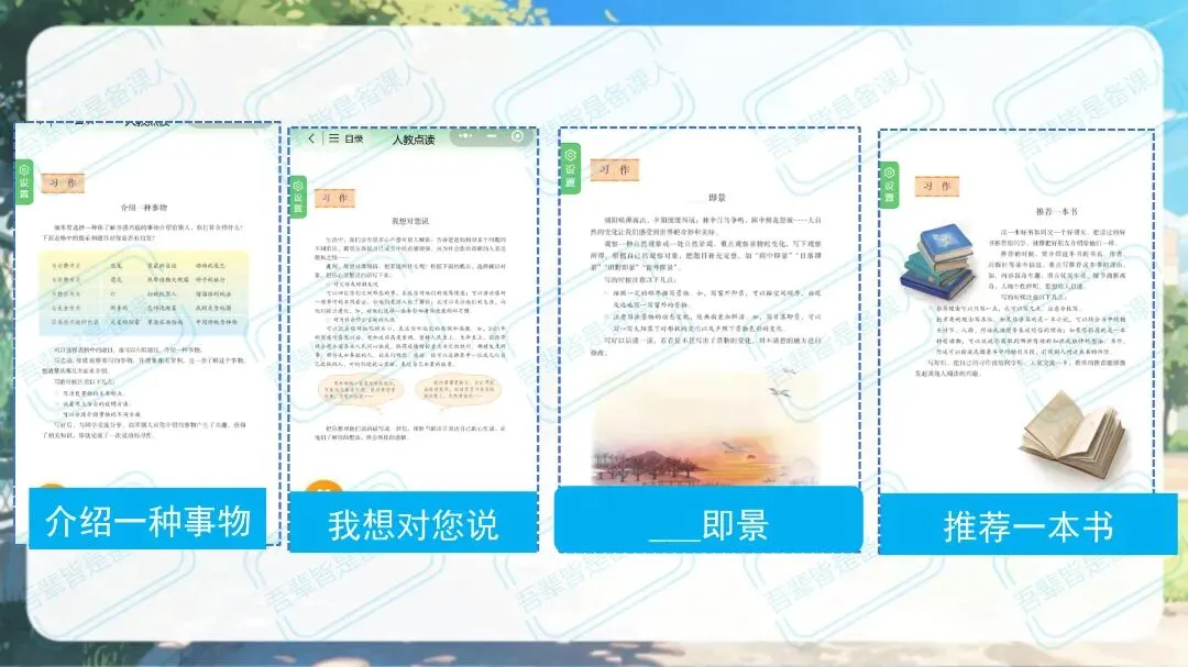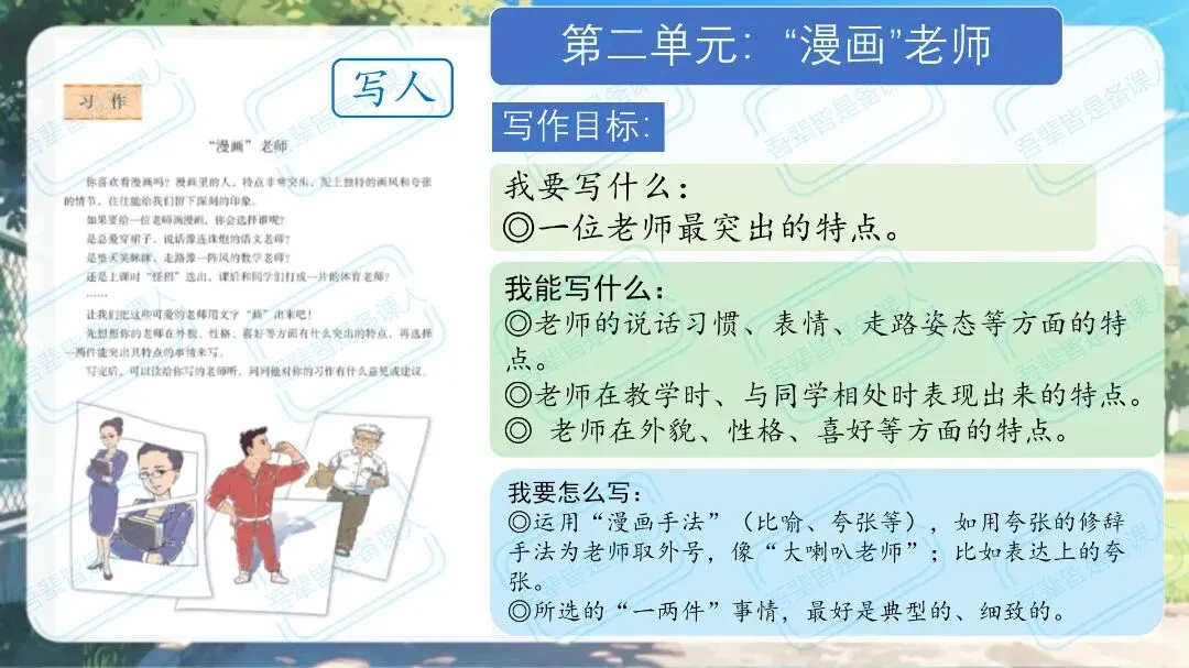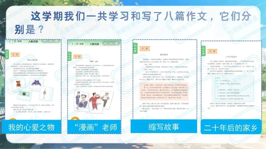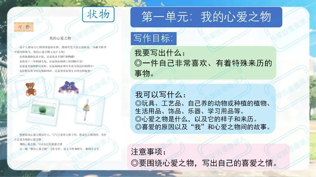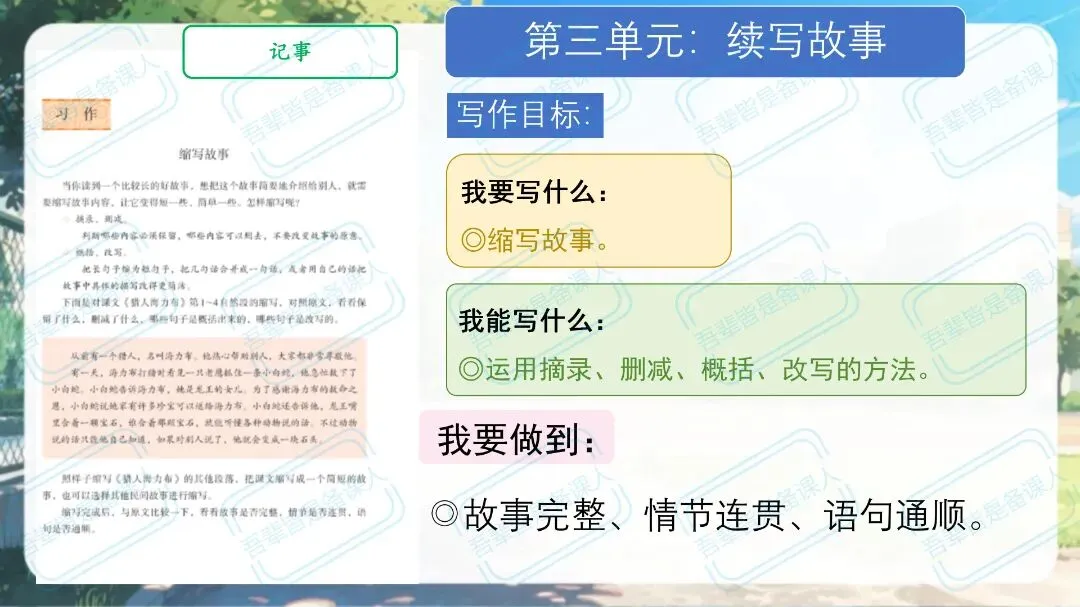 设计思路:唤醒单元习作记忆,明确五年级习作的新要求。按单元顺序呈现 8 篇习作的原题要求和核心任务,突出五年级作文的进阶点。比如《我的心爱之物》要写清 “来历 + 故事 + 情感”,《“漫画” 老师》要用上 “夸张手法”,《缩写故事》要掌握 “摘录、删减、概括” 的技巧。