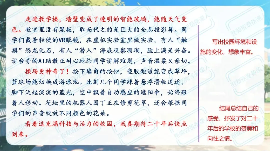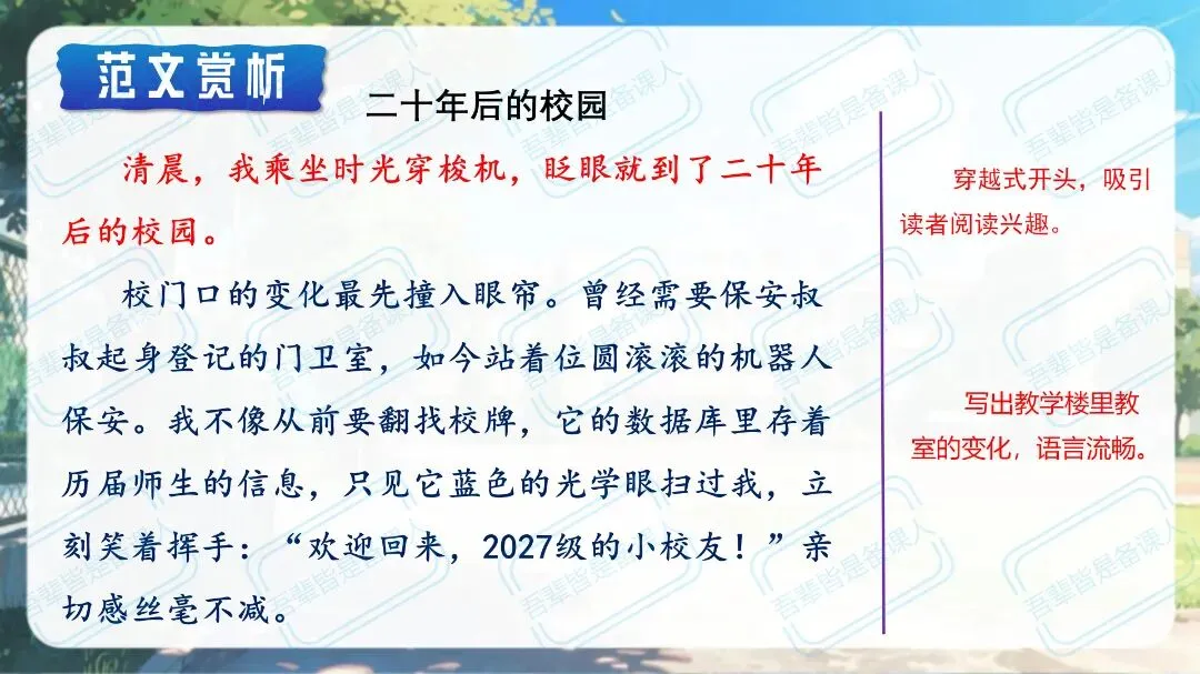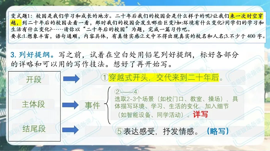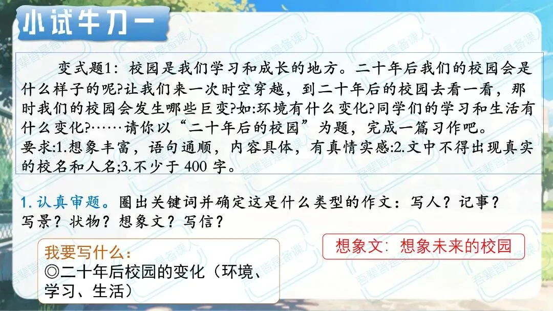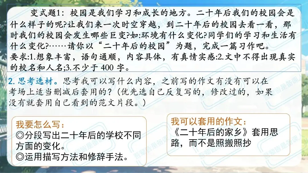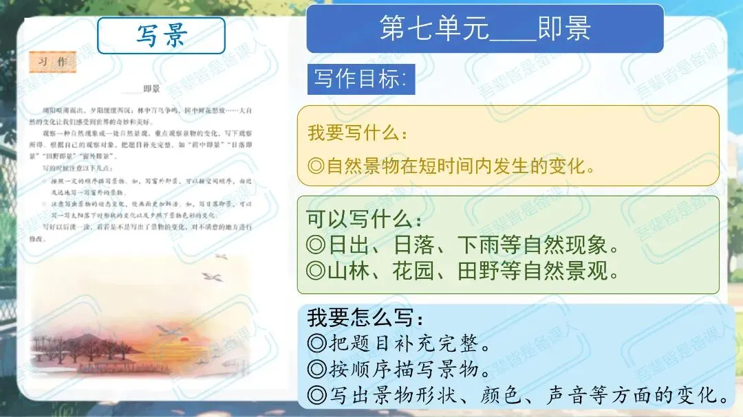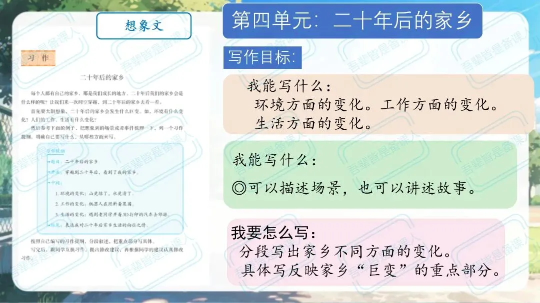 用提问和举例引导学生回忆写作重点,比如写《二十年后的家乡》要从环境、工作、生活三个角度想象巨变,写《___即景》要突出 “景物动态变化”。