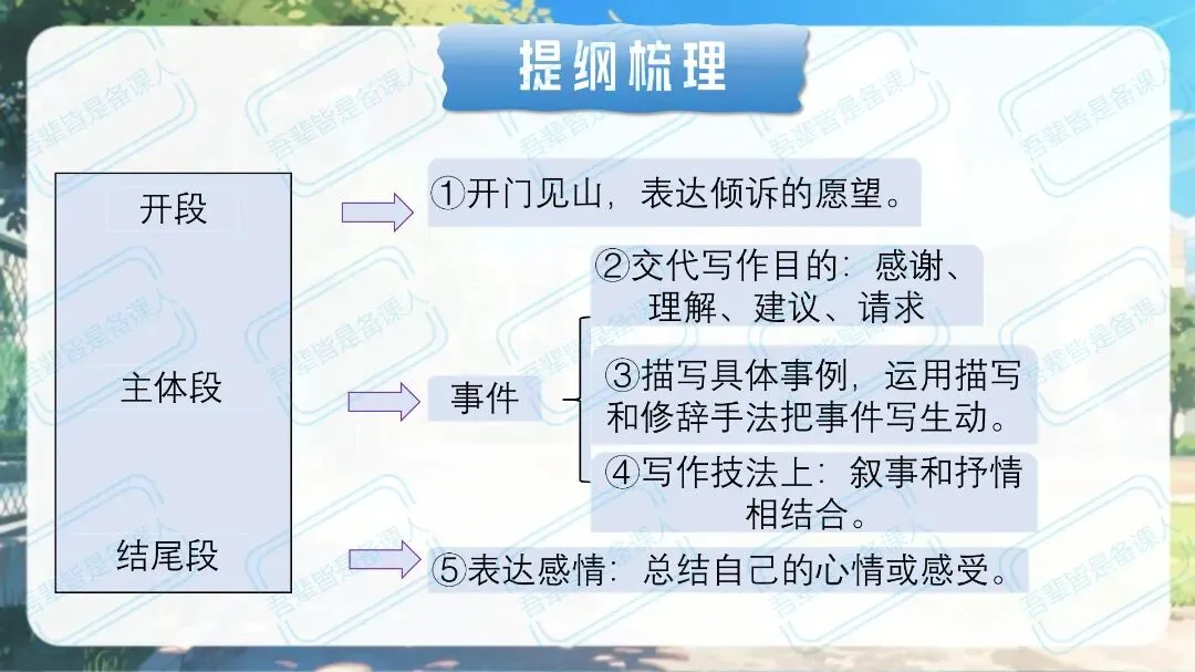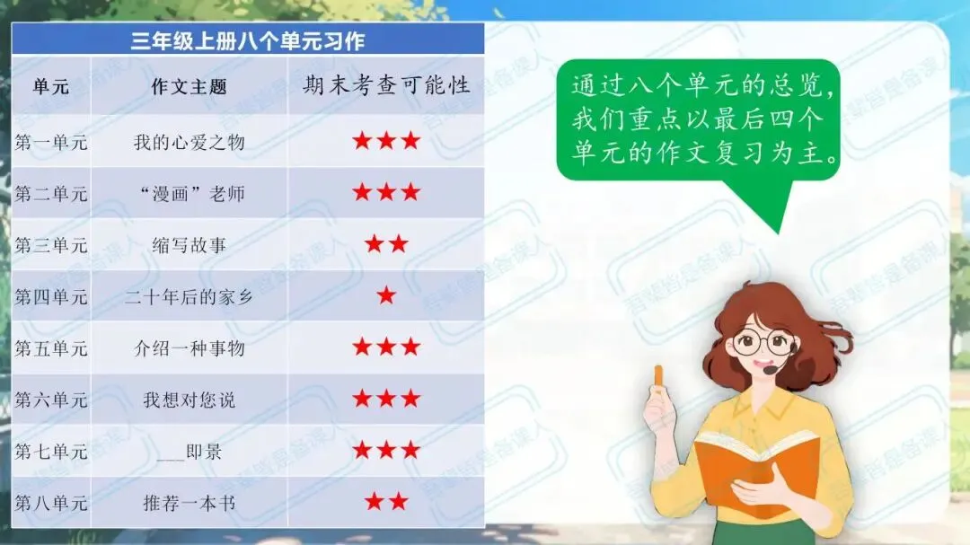 此环节的核心是搭建复习框架,让学生清楚本学期作文的类型和能力目标,为后续系统梳理打基础。
