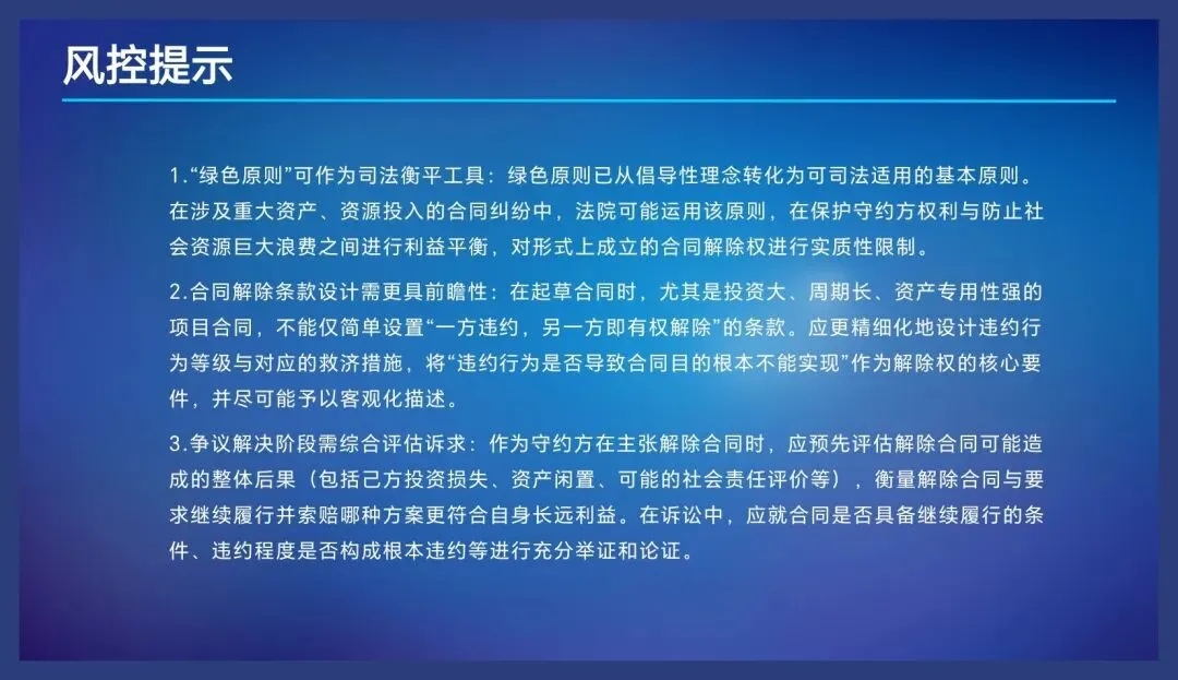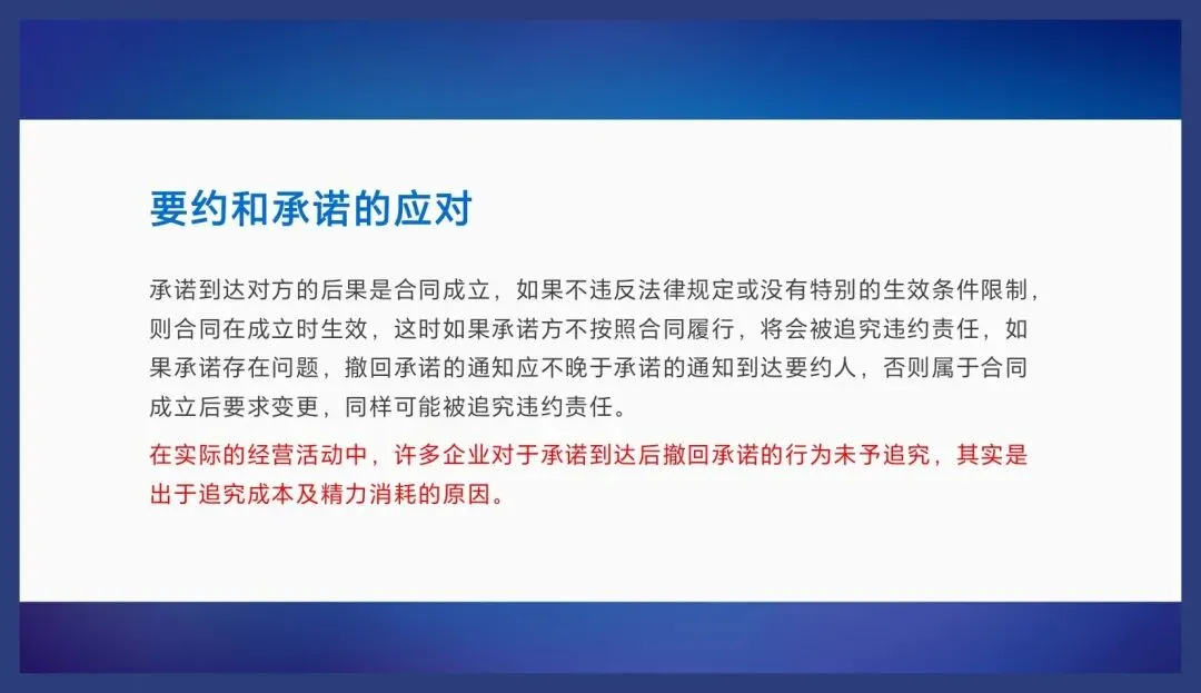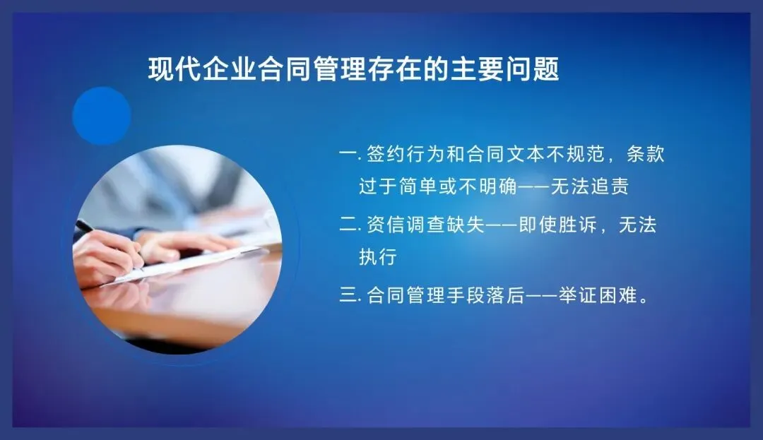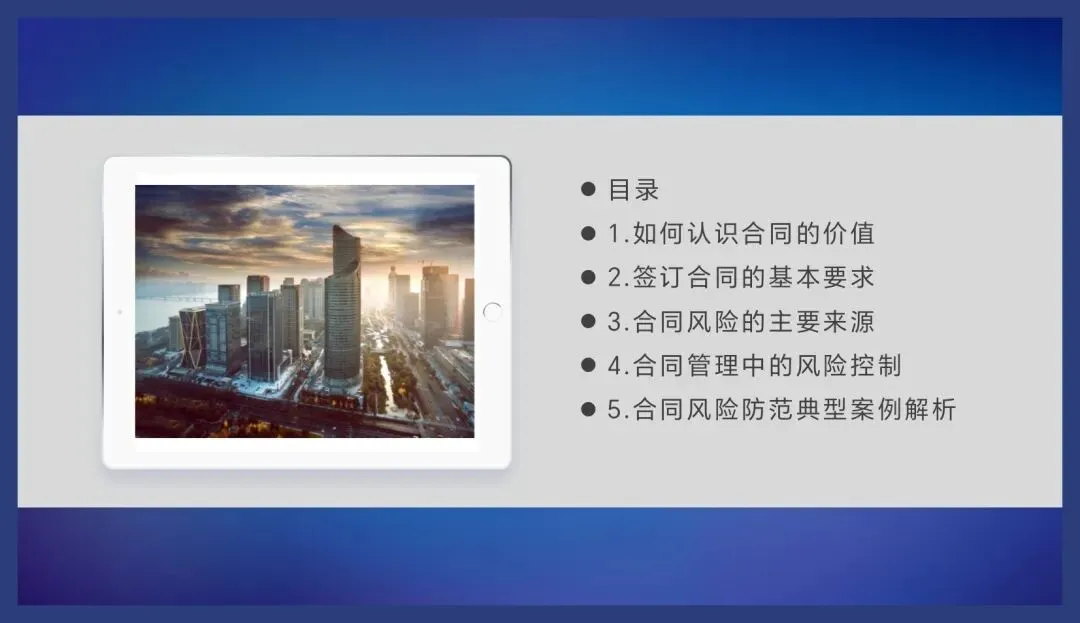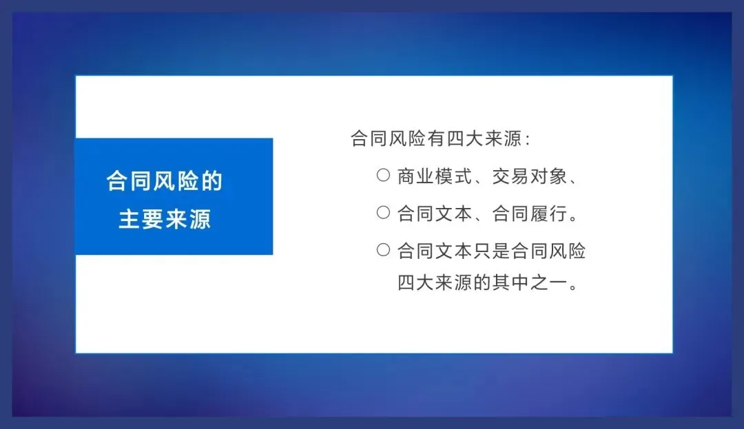 综上所述,我们作为企业管理人员、律师或者法务每天跟合同打交道,一定要深刻地理解合同的商业意义,我们理解了合同的商业价值,也就容易理解合同的性质,我认为它首先是个商业文件,因为它承载的是生意,体现的是交易,其次他才是个法律文件,同时它也是个管理文件,所以合同不光是法务的事儿,也是业务的事儿,也是管理的事儿,是我们所有人的事儿,企业通过一份一份的合同,从签约到履约的过程来实现合同目的,最终帮助企业实现业绩的合同,在企业管理中承担着保障交易安全创造效益的重要功能。