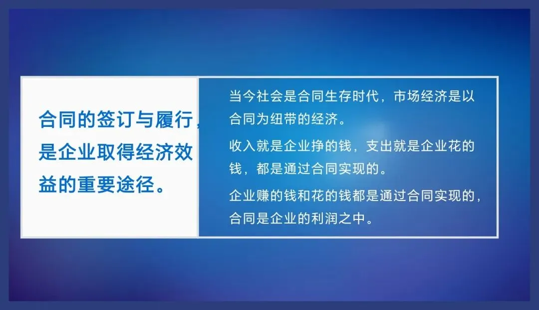 大家想一想企业的利润是怎么来的?利润等于收入减支出,收入就是企业挣的钱,支出就是企业花的钱,这些是不是都是通过合同实现的,因此合同是企业的利润之中。