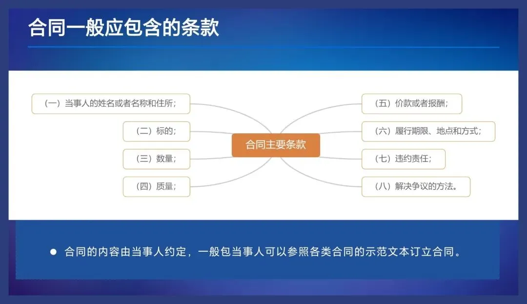 民法典第四百七十条 合同的内容由当事人约定,一般包括下列条款: (一)当事人的姓名或者名称和住所; (二)标的; (三)数量; (四)质量; (五)价款或者报酬; (六)履行期限、地点和方式; (七)违约责任; (八)解决争议的方法。 当事人可以参照各类合同的示范文本订立合同。