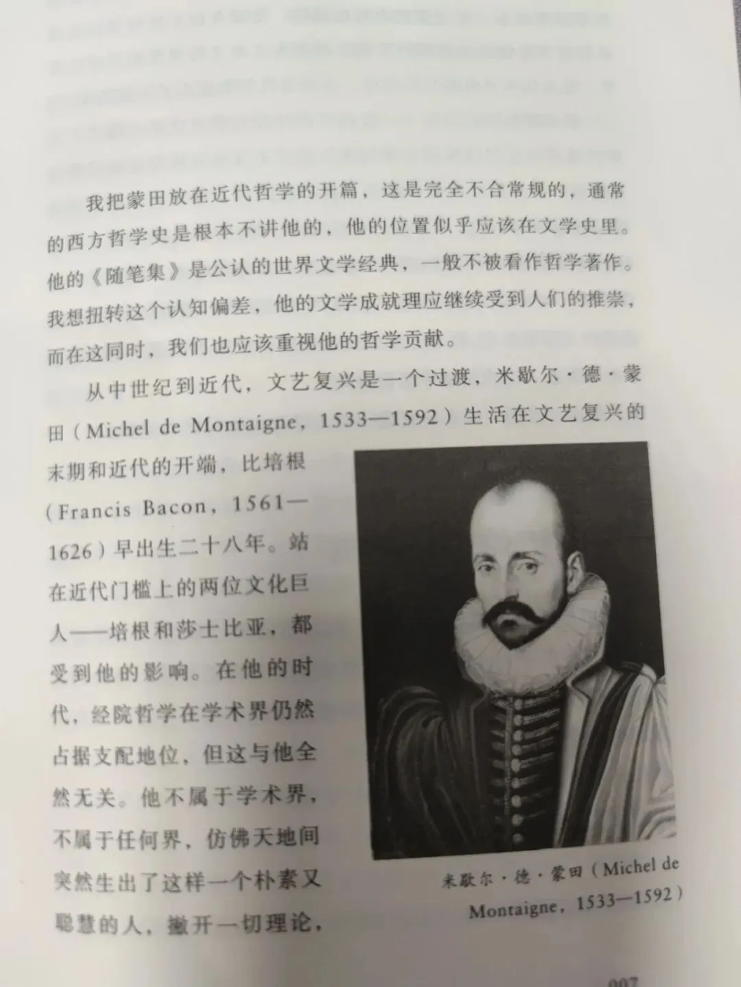 米歇尔.德.蒙田生活在文艺复兴的末期和近代开端,他用最本真、最直接的方式探究人性和人生问题,把哲学带回到原始的状态,使之重或永恒的品格。他没有创立任何可以供后来的哲学家继承和批判的学说,却用人文主义精神熏染了近代哲学。蒙田是法国波尔多人,曾两度担任波尔多市市长。他三十八岁时开始过归隐的读书和写作生活,不过这好像没有妨碍他处理政务,因为第二次担任市长是在归隐之后。他最用心的事情是写《随笔集》,生前三卷都已先后出版。