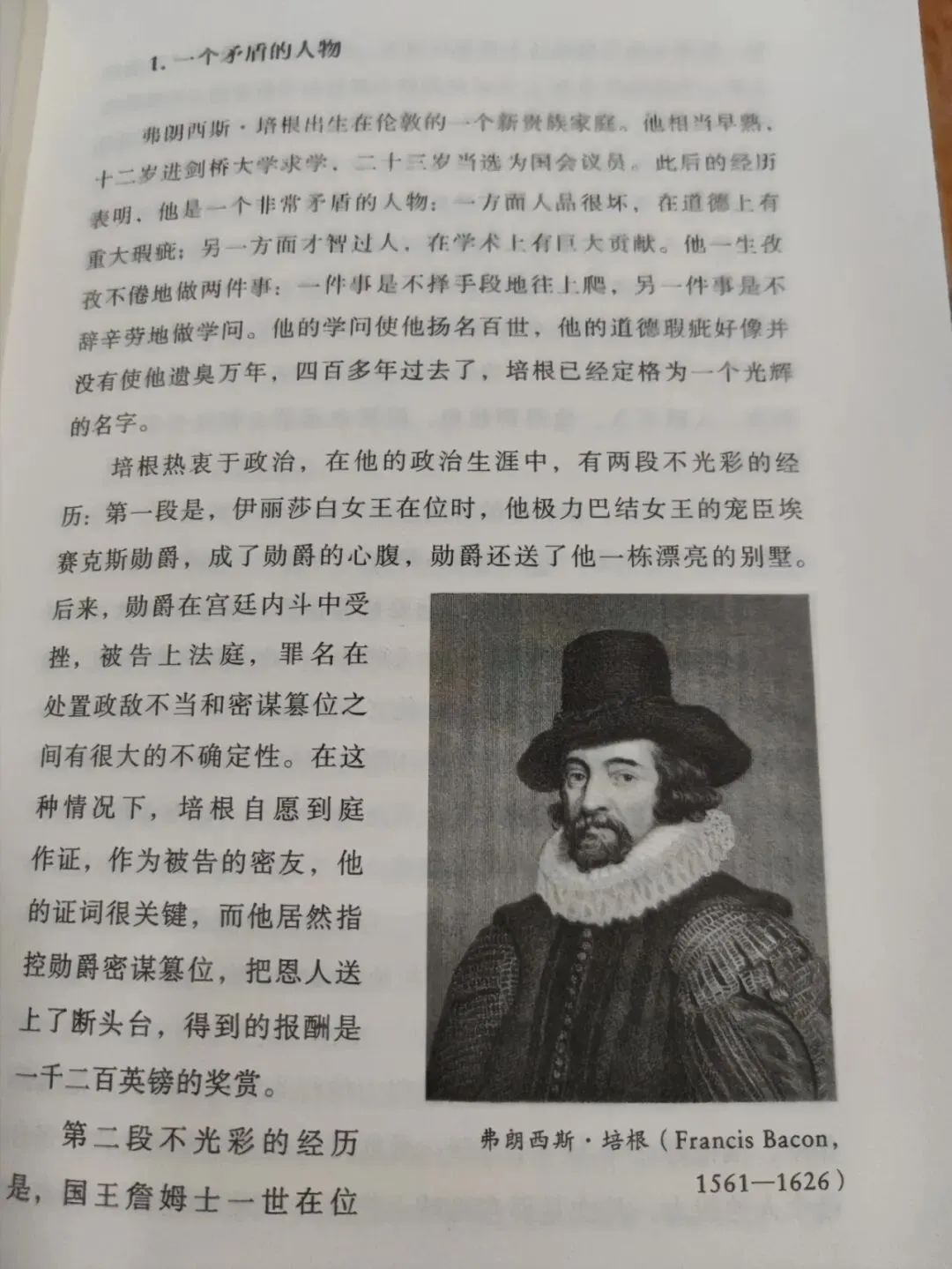 培根是一个非常矛盾的人物,一方面人品很坏,在道德上有重大瑕疵;另一方面才智过人,在学术上有巨大贡献。他一生孜孜不倦地做两件事:一件事是不择手段地往上爬,另一件事是不辞辛劳地做学问。他的学问使他扬名百世,他的道德好像并没有使他遗臭万年,四百多年过去了,培根已经定格为一个关辉的名字。