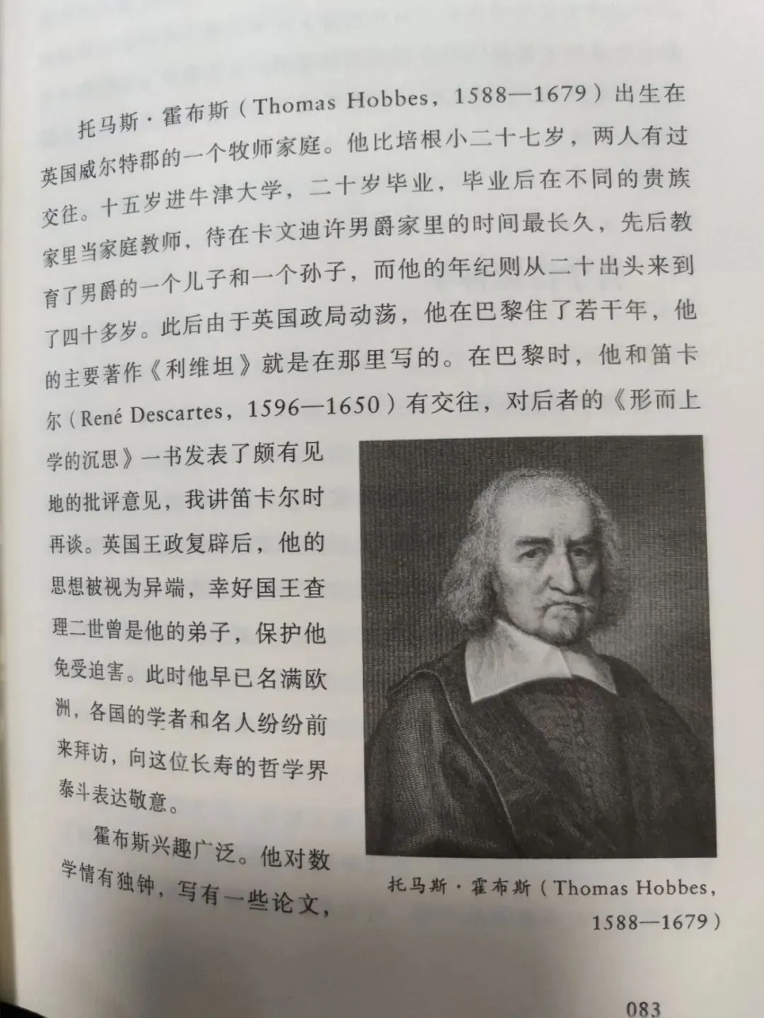 找到第一原理之后,笛卡尔高兴极了,把他的发现写成文章,寄给同时代几个最有学问的人,请他们反驳。这几个人都提出来自己反驳或质疑,笛卡尔又一一答辩,最后他把文章、反驳、答辩结集成一本书出版,就是《形而上学的沉思》(中译本《第一哲学沉思录》)。在参加讨论的人中,有一位英国哲学家霍布斯,当时他正在旅居巴黎,发表了许多有意思的看法,本节详细介绍了霍布斯对笛卡尔的反驳。
