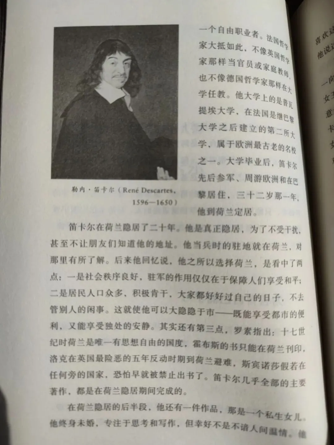 笛卡尔哲学分三部曲,怀疑一切是认识论,“我思故我在”是认识论向本体论的过渡,二元论与上帝存在的证明是本体论。罗素评论说,笛卡尔哲学的建设性部分远不如破坏性部分有意思,所谓建设性部分就是指笛卡尔的本体论。近代哲学往后发展,否定本体论越来越成为主流,笛卡尔的本体论显得像中世纪的残余,因此罗素说它意义不大。书中也介绍笛卡尔的本体论,即灵肉二元与上帝,重点包括:灵魂和肉体是不同的实体;关于两种不同实体发讨论;上帝是最高实体;对笛卡尔本体论的分析等。