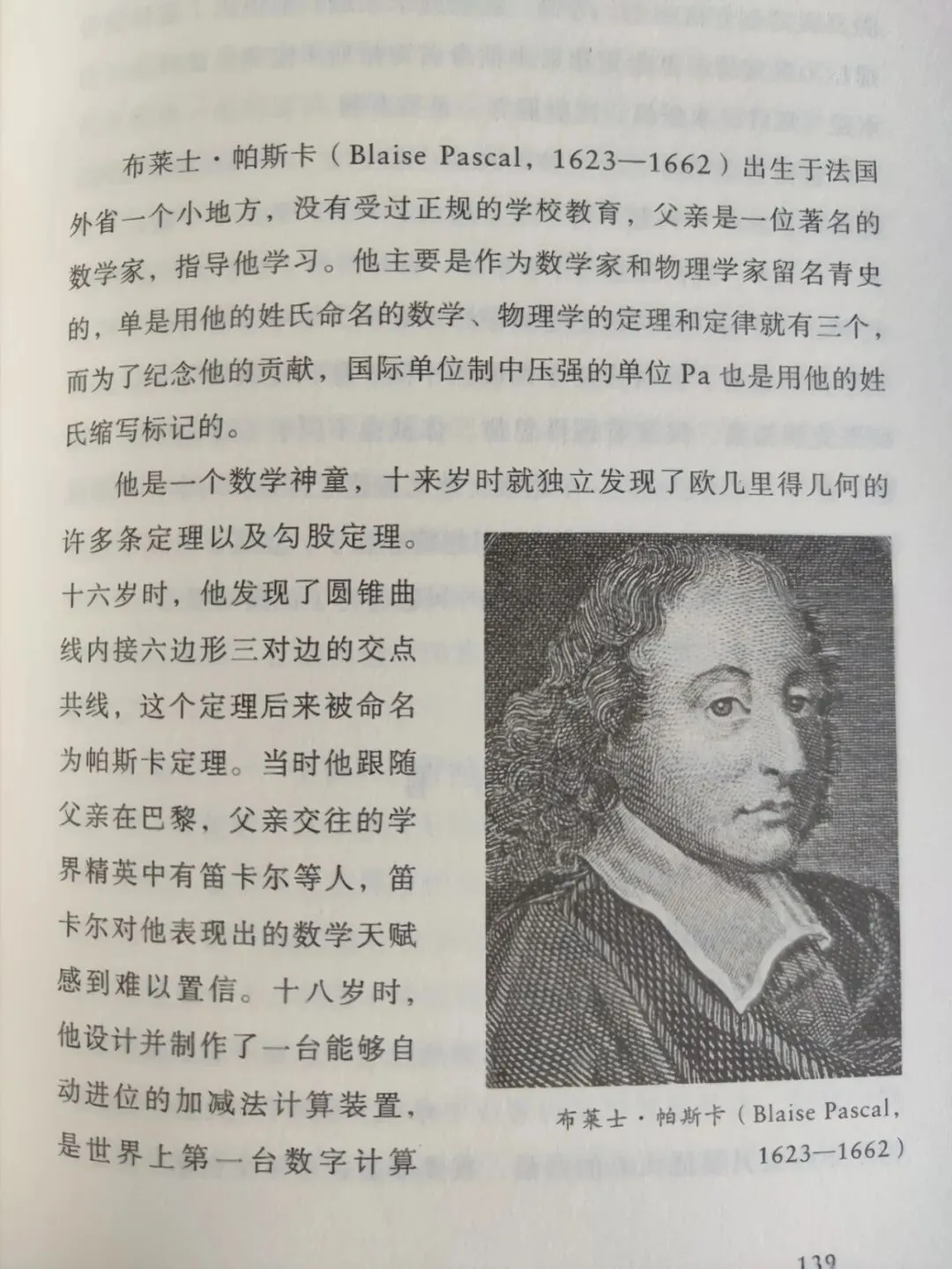 布莱士.帕斯卡主要是作为数学家和物理学家名留青史,他发现了圆锥曲线内接六边形三对边的交点共线,设计了世界上第一台数字计算器,他在数学上的成就还包括:代数中命名为“帕斯卡三角形”的二项式展开式系数规律;以积分学原理解决摆线问题,启发了微积分学的建立;与数学家费马共同创立概率论,等等。在物理学领域,他提出了流体能传递压力的定律,这个定律后来被命名为帕斯卡定律。此外他还有水银气压计、水压机、注射器等一系列发明。