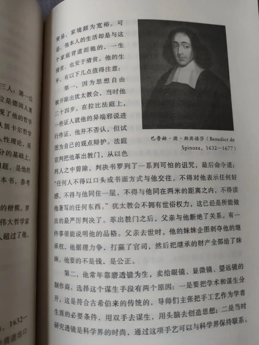 巴鲁赫.德.斯宾诺沙出生在荷兰的一个犹太家庭,父亲是一个富商,经营进口贸易,家境颇为富裕。可是,他本人的生活却是与这个家庭背道而驰的,一生清贫,也安于清贫。书中介绍了他的生平,因为思想自由被开除犹太教会,革除教会后,父亲与他断绝了关系,父亲去世后,他的妹妹企图剥夺他的继承权,他据理力争,打赢了官司,然后把继承的财产全部给了妹妹。他要的不是钱,而是公正。他常年靠磨透镜为生,卖给眼镜、显微镜、望远镜的制作商。为了不受打扰,安静写作,他一生中几度易地居住,但始终没有超出荷兰的范围。为了保持自由,他安于贫困,不止一次拒绝来自有权者的赞助。他生前出版的著作只有《笛卡尔哲学原理》和《神学政治论》两本,他死后出版的著作有《神、人及其幸福简论》《伦理学》《政治论》《知性改进论》《书信集》等。