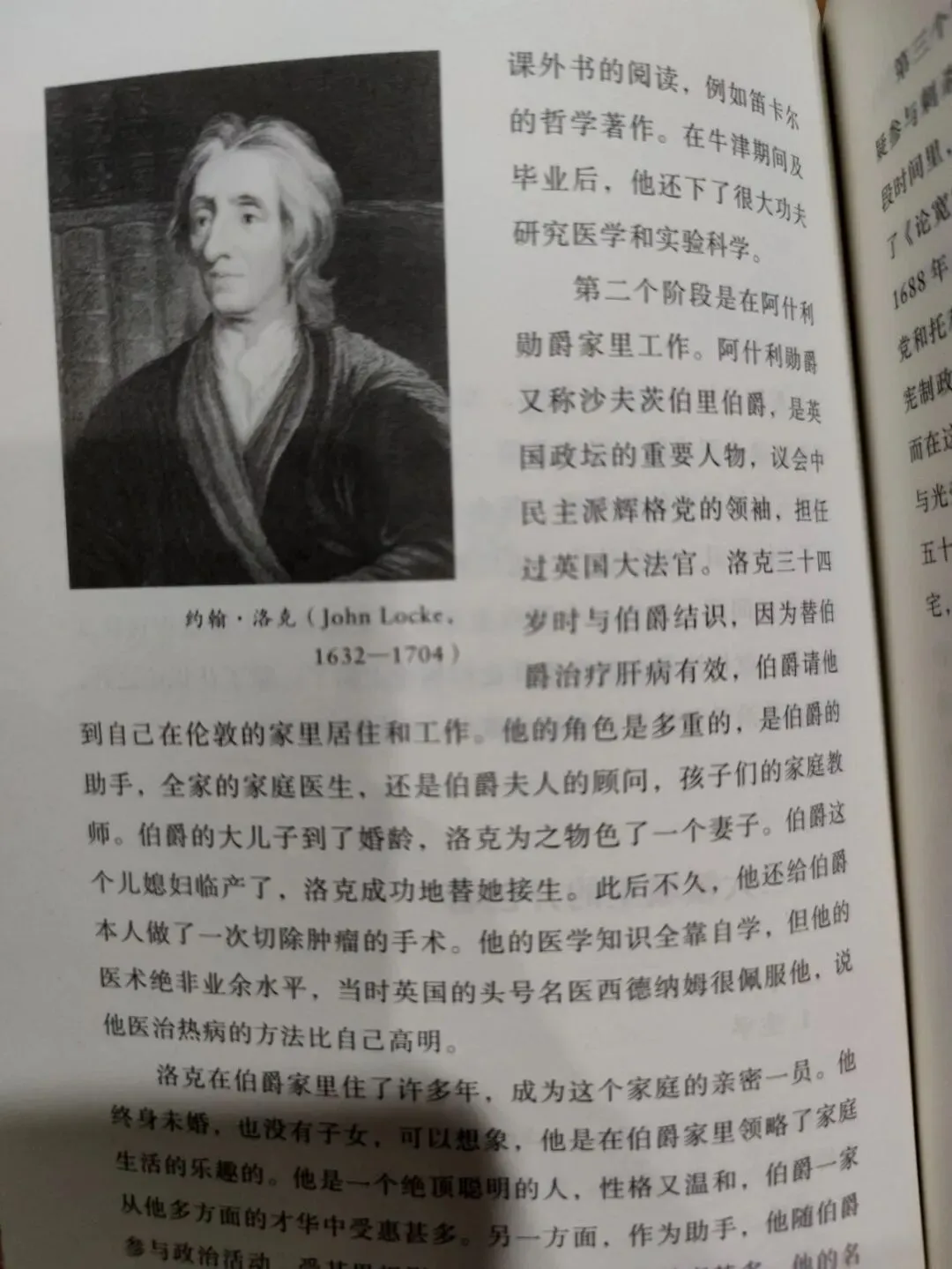 约翰.洛克是第一位立足于经验论对认识论问题进行深入系统研究的哲学家。他出生在英国萨默塞特郡的一个平民家庭,在农村长大。他的一生,主要分为三个阶段。第一阶段是求学和自学。他二十岁进入在牛津大学基督教堂学院,对哲学、医学、实验科学都要涉猎。第二阶段是在阿什利勋爵家里工作。他是勋爵的助手,全家的家庭医生,还是勋爵夫人的顾问,孩子们的家庭教师。第三阶段,主要从事写作。五十一岁时,因为无端被怀疑参与刺杀国王的阴谋,他逃亡至荷兰,在那里住了五年,完成了《论宽容》《政府论》《人类理解论》《教育片论》等主要著作。光荣革命后,他回到英国,直至七十二岁去世。