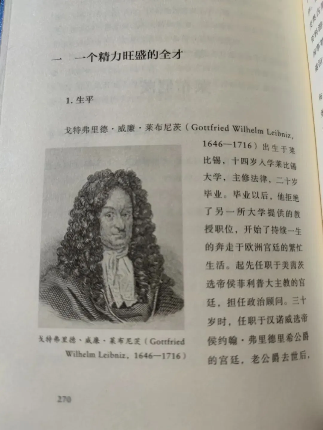 戈特弗里德▪威廉▪莱布尼茨出生于莱比锡,十四岁入学莱比锡大学,主修法律,二十岁毕业。毕业后,他拒绝了另一所大学提供的教授职位,开始持续一生的奔走欧洲宫廷的繁忙生活,起先任职于美茵茨选帝侯菲利普大主教的宫廷,担任政治顾问。三十岁时,任职于汉诺威选帝侯约翰▪费里德里希公爵的宫廷,老公爵去世后,受继任者的公爵恩斯特▪奥古斯特续聘,直到去世。