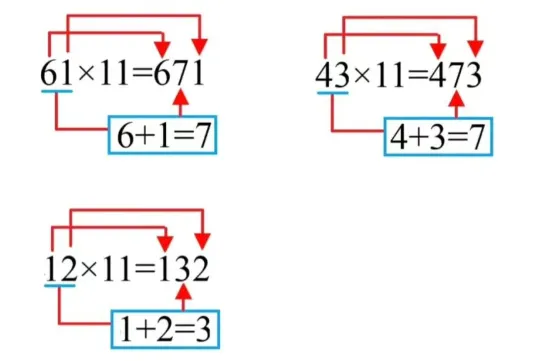 观察竖式即可发现,结果的两边分别为1和8,中间是1+8=9总结:两位数乘11,如果个位上和十位上的数字相加不满十,积的个位上写两位数个位上的数字,积的百位上写两位数十位上的数字,积的十位上写两位数的个位和十位上的数字之和1、把235第一位上的数字2和最后一位上的数字5分开写下来,中间留下来两个空位。如25