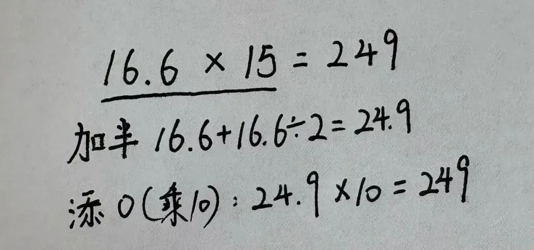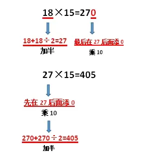 解析:18×15=270;根据口诀加半添0,18加半(18➗2)=27,最后在27后添0 27×15=405;根据口诀添0加半,先在27后面添0得270,再在270后加半(270➗2)最后得405总结:双数同15相乘时,先加半再添0;单数同15相乘时,先添0再加半【延伸】此方法适用1个小数同15相乘(确保小数可以整除2)1、首先要熟记: